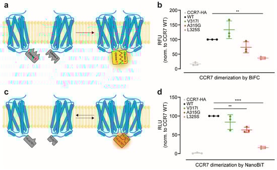 Differences in the dimerisation states of CCR7 and point mutants thereof: (a) schematic overview of the split-citrine complementation assay. Upon CCR7 dimerisation split-citrine complements and emits fluorescence upon excitation. Split-citrine complementation is relatively stable and essentially locks the fused proteins in their dimeric form; (b) dimerisation states of human CCR7 variants assessed by BiFC. Fluorescence of complemented split-citrine 1 and split-citrine2 each fused to variants of CCR7. HeLa cells were transiently transfected with CCR7 wild-type (WT), the CCR7 SNP V317I, or the CCR7 dimerisation-defective A315G and L325S mutants each fused to the split-citrine halves. CCR7-HA served as negative control. Relative fluorescence units (RFUs) for each receptor pair were normalised to CCR7 WT; (c) scheme of the split-luciferase complementation assay. Due to a micromolar dissociation constant between the split-luciferase subparts, receptor dimerisation remains transient and more dynamic; (d) dimerisation states of human CCR7 variants assessed by the split-luciferase complementation assay. Relative luminescence units (RLUs) upon CCR7 dimerisation were determined in transiently transfected HeLa cells. (b,d) n = 3, mean ± SD, statistical analysis: one-way ANOVA. ** p < 0.01; **** p < 0.0001.