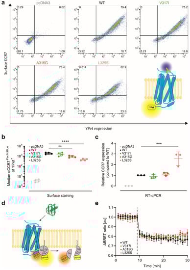 HeLa cells were transiently transfected either with pcDNA3 (empty vector), pcDNA3 hCCR7-YPet, pcDNA3 hCCR7-YPet V317I, pcDNA3 hCCR7-YPet A315G, or pcDNA3 hCCR7-YPet L325S. After 40–44 h, cells were washed with PBS and detached with PBS supplemented with 0.5 mM EDTA. Total RNA was isolated according to the RNeasy Mini Kit (QIAGEN, Venlo, The Netherlands), and 1 μg RNA was transcribed into cDNA using a High-Capacity cDNA Reverse Transcriptase Kit (ThermoFisher) and additional RNase inhibitor (ThermoFisher), according to the manufacturer’s instructions. Quantitative real-time PCR (RT-qPCR) was performed using a Fast SYBRTM Green Master Mix (ThermoFisher) and 5 μM of the corresponding forward and reverse primer pairs (CCR7: QIAGEN, QT01666686; β2-microglobulin: 3′-GCT ATC CAG CGT ACT CCA AAG ATT, 3′-CAA CTT CAA TGT CGG ATG GAT GA; ubiquitinC: 3′-ATT TGG GTC GCA GTT CTT G, 3′-TGC CTT GAC ATT CTC GAT GGT). RT-qPCR was performed on a 7900HT Fast Real-Time PCR System (ThermoFisher) using the SDS standard software and a preinstalled protocol (ThermoFisher).