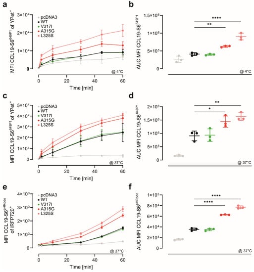Dimerisation-defective CCR7 mutants own higher CCL19 binding and uptake capacities: (a) dimerisation-defective CCR7 mutants are superior in CCL19 binding. HeLa cells were transiently transfected with YPet-tagged CCR7 variants and incubated at 4 °C for indicated time periods with 25 nM of fluorescently labelled CCL19-S6649P1. Cells were extensively washed, and mean fluorescence intensities (MFIs) of CCL19-S6649P1 bound to CCR7 variants were measured by flow cytometry; (b) quantification of CCL19-S6649P1 binding to CCR7 variants. Area under the curve (AUC) of the MFI values over the entire period of measurement; (c,d) enhanced CCL19 binding and uptake by dimerisation-defective CCR7 mutants. HeLa cells were transiently transfected with YPet-tagged CCR7 variants and incubated at 37 °C for indicated time periods with 25 nM of fluorescently labelled CCL19-S6649P1 and assessed by flow cytometry as in (a,b); (e,f) enhanced CCL19 internalisation by dimerisation-defective CCR7 mutants. HeLa cells were transiently transfected with YPet-tagged CCR7 variants and incubated at 37 °C for indicated time periods with 25 nM of CCL19-S6pHRodo and assessed by flow cytometry as in (a,b); (a–f) n = 3, mean ± SD, statistical analysis: one-way ANOVA. * p < 0.05; ** p < 0.01; **** p < 0.0001.