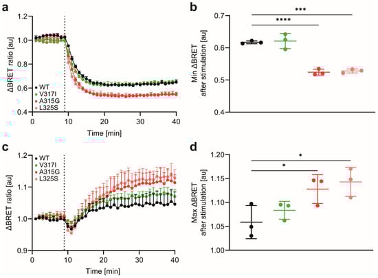 To further assess chemokine-driven receptor internalisation and sorting, we used established BRET sensors [] to quantitatively monitor the trafficking of the CCR7 variants. First, we measured agonist-induced sequestration of CCR7 from the plasma membrane, manifested with a decrease in the BRET signal between CCR7-rLuc8 and the plasma membrane marker rGFP-CAAX (a polybasic sequence with the prenylated CAAX box of the GTPase KRas). CCR7 WT was readily internalised upon CCL19 activation, as expected (Figure 4a,b). The CCR7 SNP V317I showed comparable endocytosis kinetics (Figure 4a,b), with no significant difference from CCR7 WT. By contrast, the CCR7 dimerisation-defective mutants A315G and L325S internalised significantly better upon CCL19 stimulation than CCR7 WT (Figure 4a,b). Second, we measured receptor sorting to early endosomes. As a BRET acceptor, we used rGFP-FYVE (the FYVE domain of endofin), which binds phosphatidylinositol 3-phosphate in early endosomes. As expected, CCL19 stimulation of CCR7 WT led to an increased BRET signal (Figure 4c,d), demonstrating that internalised CCR7 was sorted to early endosomes. The CCR7 SNP V317I followed a comparable sorting kinetic as that of CCR7 WT, while the monomer-shifted CCR7 mutants A315G and L325S showed significantly higher BRET signals (Figure 4c,d). Collectively, these data provide evidence that the CCR7 mutants that are shifted towards a monomeric expression are superior in CCL19 binding and uptake. Moreover, these CCR7 dimerisation-defective mutants are more efficiently internalised and sorted to early endosomes.