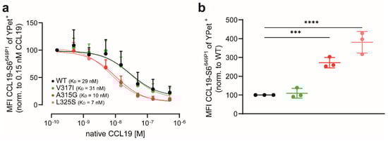 Crystallisation of the first chemokine receptor revealed that CXCR4 is able to form dimers []. The structure-based observation of CXCR4 dimers raised the question as to whether its ligand CXCL12 binds to one single receptor or to both protomer(s) of the dimer. The following possible receptor–ligand stoichiometries were proposed: a monomeric 1:1, a 2:1 with both protomers of the dimer interacting with one ligand, or a 2:2 stoichiometry with a chemokine dimer binding to both protomers of a receptor dimer []. A subsequent study provided evidence that despite its dimeric nature, CXCR4 interacts with its chemokine ligand in a 1:1 stoichiometry []. In contrast to CXCL12, no evidence exists that the CCR7 ligand CCL19 can form dimers [], raising the question of how monomeric CCL19 interacts with CCR7 and its dimerisation mutants. We thus exploited our recently developed site-specific fluorescently labelled CCL19 [], to study chemokine binding to the CCR7 variants. To this end, we incubated HeLa cells transiently expressing YPet-tagged CCR7 variants at 4 °C for indicated time periods with 25 nM fluorescently labelled CCL19-S6649P1. To our surprise, the two dimerisation-defective CCR7 variants A315G and L325S showed significantly higher CCL19-S6649P1 binding than CCR7 WT (Figure 3a,b). Notably, CCR7 WT and V317I owned similar CCL19-S6649P1 binding capacities (Figure 3a,b).