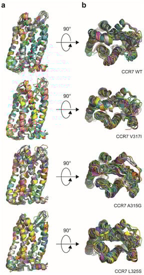 An often discussed theme in the chemokine receptor field concerns the stoichiometry of the receptor–ligand interaction, particularly for CXCR4:CXCL12 [,,]. As CCL19 does not form dimers [], it remained unclear how monomeric CCL19 interacts with its receptor protomers. Here, we clearly showed that the fluorescence of CCL19-S6649P1 bound to its receptor is about twice as high in cells expressing the CCR7 A315G or L325S mutants, compared with wild-type CCR7, which constitutively forms dimers. This suggests that monomeric CCL19 best binds to monomeric CCR7. Inspired by this discovery, we modelled possible changes provoked by the introduced point mutations in the arrangements of the α-helices of CCR7 based on its solved crystal structure []. To this end, we subjected the sequences of CCR7 WT and the three-point mutations under study to the automated CABS-flex 2.0 online modelling procedure to gain information on the protein structure flexibility. Then, possible models for each receptor variant were colour-coded and overlaid on each other (Figure 6). Inspecting the receptor side views revealed highly conserved arrangements of the overall transmembrane domains (Figure 6a). Interestingly, examining the top views of the individual CCR7 mutants suggests more flexibility for the extra- and intracellular loops (Figure 6b). Specifically, introducing the A315G and the L325S mutation rendered the extracellular loops more flexible and less structured compared to CCR7 WT and the CCR7 SNP V317I. We therefore propose that the chemokine recognition site 2 (CRS2) located in the pocket of the receptor transmembrane helical domain [] is more flexible and better accessible in the monomeric than in the dimeric CCR7 form. Notably, on the intracellular part of the receptor, CCR7 oligomerisation was shown to establish a unique signalling scaffold that allows Src kinase association with the oligomer, which is activated upon ligand binding []. Consequently, cells expressing the CCR7 SNP V317I include Src kinase-dependent signalling aside from the canonical Gi-protein signalling pathway to facilitate efficient cell migration []. Hence, the reduced capacity of CCR7 SNP V317I, compared with CCR7 WT, to internalise upon CCL19 stimulation might further contribute to the enhanced migratory response of CCR7-SNP-V317I-expressing cells [,].
