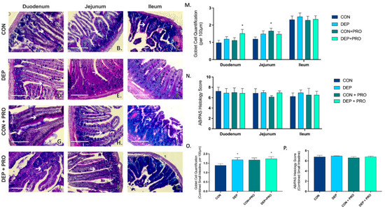 AB/PAS staining was used to determine mucus production and quantified goblet cells in the duodenum, ileum, and jejunum. Alcian blue stains highly acidic mucopolysaccharides blue and PAS stain neutral-acidic mucopolysaccharides pink. Intestinal goblet cells contain both neutral and acidic mucins which can be determined by a deep purple stain within the intestinal villi structure. Figure 1A–L shows representative images of AB/PAS staining through the regions of the small intestine and white arrows identify goblet cells within the villi. We observed a regional difference with DEP and probiotic treatment in the duodenum and jejunum when compared to CON (Figure 1M); however, there was no change in mucus production across any of the regions of the small intestines (Figure 1N). When looking at global expression throughout all regions of the intestine combined, we observed a significant increase in goblet cell formation with DEP exposure compared to CON (p = 0.049) (Figure 1O); however, there were no differences with exposure or probiotics in mucus production in the small intestines (Figure 1P).