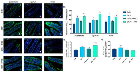 Exposure to inhaled diesel exhaust particles increases mucin 2 (MUC2) expression in the small intestine of C57Bl/6 male mice, regardless of probiotic treatment. Representative images of MUC2 expression in the three regions of the small intestine of C57Bl/6 male mice on a high-fat diet exposed to saline (CON; A–C), diesel exhaust particles (DEP-35 µg PM; D–F), saline and probiotics (CON + PRO, 0.3 g/d of Ecologic® Barrier probiotics; G–I), or diesel exhaust particles and probiotics (DEP + PRO, 0.3 g/d of Ecologic® Barrier probiotics; J–L) twice a week for 4 w. Panels show merged images within the duodenum (A,D,G,J), jejunum (B,E,H,K), and ileum (C,F,I,L). Green fluorescence indicates MUC2 expression and blue fluorescence indicates nuclear staining (Hoechst). Graph (M) shows the histological analysis of MUC2 by region, (N) shows the global (cumulative expression of three portions) analysis of MUC2 expression in the small intestine, and (O) shows the global mean normalized gene expression of MUC2 mRNA transcript expression in the small intestine, as determined by RT-qPCR. 40× magnification, scale bar = 100 µm. Data are depicted as ± SEM with * p < 0.05 compared to CON, † p < 0.05 compared to DEP, and ‡ p < 0.05 compared to CON + PRO.