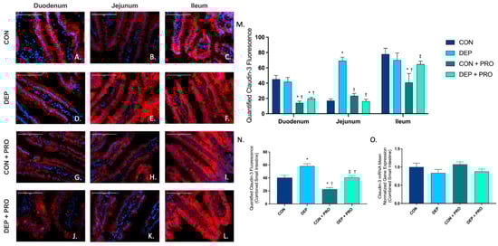 To determine the expression and localization of intracellular TJ protein ZO-1 within the small intestine, we used immunofluorescent staining in the duodenum, jejunum, and ileum. Figure 5A–L shows representative pictures of ZO-1 (red) expression throughout the regions of the small intestine for all groups. Globally within the small intestine, we found a significant increase in ZO-1 expression with DEP compared to CON (Figure 5N), which expressed significantly higher in the duodenum (Figure 5M). Interestingly, we found that probiotics resulted in an increase in ZO-1 expression, which was observed regionally and globally. When compared to CON + PRO, ZO-1 expression in CON + DEP was significantly lower in the ileum (Figure 5M) only, which accounts for the overall global decrease in ZO-1 (Figure 5N). Overall, ZO-1 expression in the small intestine was significantly altered by probiotics and exposure-probiotic interactions (exposure F = 2.579, p = 0.110; probiotics F = 11.09 p = 0.001; exposure × probiotics F = 18.71, p < 0.001). We also measured the expression of ZO-1 mRNA and found when compared to CON, there was a significant decrease in DEP and CON + PRO groups (Figure 5O). Furthermore, there was a significant increase in ZO-1 in DEP + PRO when compared to the CON + PRO group.