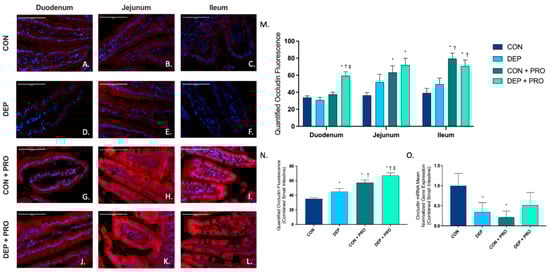 Exposure to inhaled diesel exhaust particles result in an increase in occludin expression in the small intestine of C57Bl/6 male mice. Representative images of occludin expression in the three regions of the small intestine of C57Bl/6 male mice on a high-fat diet exposed to saline (CON; A–C), diesel exhaust particles (DEP-35 µg PM; D–F), saline and probiotics (CON + PRO, 0.3 g/d of Ecologic® Barrier probiotics; G–I), or diesel exhaust particles and probiotics (DEP + PRO, 0.3 g/d of Ecologic® Barrier probiotics; J–L) twice a week for 4 w. Panels show merged images within the duodenum (A,D,G,J), jejunum (B,E,H,K), and ileum (C,F,I,L). Red fluorescence indicates occludin expression and blue fluorescence indicates nuclear staining (Hoechst). Graph (M) shows the histological analysis of occludin by region, (N) shows the global (cumulative expression of three portions) analysis of occludin expression in the small intestine, and (O) shows the global mean normalized gene expression of occludin mRNA transcript expression in the small intestine, as determined by RT-qPCR. 40× magnification, scale bar = 100 µm. Data are depicted as ± SEM with * p < 0.05 compared to CON, † p < 0.05 compared to DEP, ‡ p < 0.05 compared to CON + PRO, and ○ p < 0.07 compared to CON.
