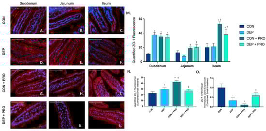 Exposure to inhaled diesel exhaust particles and probiotics alters zonula occludens 1 (ZO-1) expression regionally and globally within the small intestine of C57Bl/6 male mice. Representative images of ZO-1 expression in the three regions of the small intestine of C57Bl/6 male mice on a high-fat diet exposed to saline (CON; A–C), diesel exhaust particles (DEP-35 µg PM; D–F), saline and probiotics (CON + PRO, 0.3 g/d of Ecologic® Barrier probiotics; G–I), or diesel exhaust particles and probiotics (DEP + PRO, 0.3 g/d of Ecologic® Barrier probiotics; J–L) twice a week for 4 w. Panels show merged images within the duodenum (A,D,G,J), jejunum (B,E,H,K), and ileum (C,F,I,L). Red fluorescence indicates ZO-1 expression and blue fluorescence indicates nuclear staining (Hoechst). Graph (M) shows the histological analysis of ZO-1 by region, (N) shows the global (cumulative expression of three portions) analysis of ZO-1 expression in the small intestine, and (O) shows the global mean normalized gene expression of ZO-1 mRNA transcript expression in the small intestine, as determined by RT-qPCR. 40x magnification, scale bar = 100 µm. Data are depicted as ± SEM with * p < 0.05 compared to CON, † p < 0.05 compared to DEP, and ‡ p < 0.05 compared to CON + PRO.
