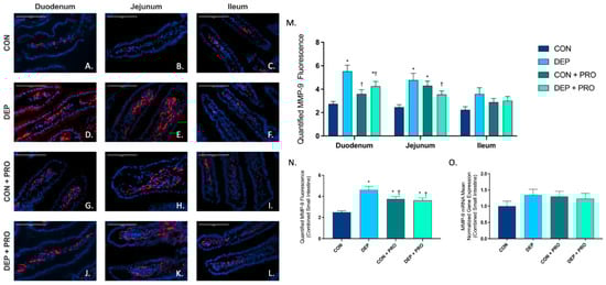 Since MMP-9 is associated with altered TJ protein expression and permeability in the small intestine, we analyzed its expression via immunofluorescent staining of the duodenum, jejunum, and ileum. Figure 6A–L shows the representative images for MMP-9 (red) expression throughout the regions of the small intestine for all groups. We observed a significant increase in MMP-9 expression in the duodenum and jejunum (Figure 6M) and globally (Figure 6N) with DEP compared to CON. We observed no significant change for MMP-9 regionally or globally for DEP + PRO compared to CON + PRO (Figure 6M,N). We see an increased expression of MMP-9 in CON + PRO when compared to CON (Figure 6N). Intestinal MMP-9 expression was driven by DEP exposure and probiotics (exposure F = 17.28, p < 0.001; probiotics F = 0.328, p = 0.568; exposure x probiotics F = 21.79, p < 0.001). We also quantified MMP-9 mRNA transcript expression in the small intestine and observed no significant differences (Figure 6O).