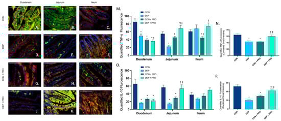 Probiotic intervention promotes intestinal inflammatory marker TNF- and IL-10 expression in the small intestine during exposure to inhaled diesel exhaust particles in C57Bl/6 male mice. Representative images of TNF-α and IL-10 expression in the three regions of the small intestine of C57Bl/6 male mice on a high-fat diet exposed to saline (CON; A–C), diesel exhaust particles (DEP-35 µg PM; D–F), saline and probiotics (CON + PRO, 0.3 g/d of Ecologic® Barrier probiotics; G–I), or diesel exhaust particles and probiotics (DEP + PRO, 0.3 g/d of Ecologic® Barrier probiotics; J–L) twice a week for 4 w. Panels show merged images within the duodenum (A,D,G,J), jejunum (B,E,H,K), and ileum (C,F,I,L). Red fluorescence indicates TNF-α expression, green fluorescence indicates iL-10 expression, yellow indicates co-localization of TNF-α and IL-10, and blue fluorescence indicates nuclear staining (Hoechst). Graph (M) shows the histological analysis of TNF-α by region, (N) shows the global (cumulative expression of three portions) analysis of TNF-α expression in the small intestine, (O) shows the histological analysis of IL-10 by region, (P) shows the global (cumulative expression of three portions) analysis of IL-10 expression in the small intestine 40× magnification, scale bar = 100 µm. Data are depicted as ± SEM with * p < 0.05 compared to CON, † p < 0.05 compared to DEP, and ‡ p < 0.05 compared to CON+PRO.