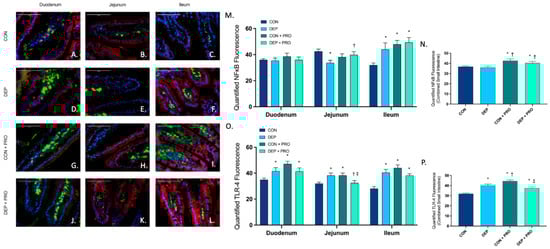Exposure to inhaled diesel exhaust particles stimulates TLR-4 expression but not NF-κB in the small intestine of C57Bl/6 male mice. Representative images of NF-κB and TLR4 expression in the three regions of the small intestine of C57Bl/6 male mice on a high-fat diet exposed to saline (CON; A–C), diesel exhaust particles (DEP-35 µg PM; D–F), saline and probiotics (CON + PRO, 0.3 g/d of Ecologic® Barrier probiotics; G–I), or diesel exhaust particles and probiotics (DEP + PRO, 0.3 g/d of Ecologic® Barrier probiotics; J–L) twice a week for 4 w. Panels show merged images within the duodenum (A,D,G,J), jejunum (B,E,H,K), and ileum (C,F,I,L). Red fluorescence indicates NF-κB expression, green fluorescence indicates TLR-4 expression, yellow indicates co-localization of NF-κB and TLR-4, and blue fluorescence indicates nuclear staining (Hoechst). Graph (M) shows the histological analysis of NF-κB by region, (N) shows the global (cumulative expression of three portions) analysis of NF-κB expression in the small intestine, (O) shows the histological analysis of TLR-4 by region, (P) shows the global (cumulative expression of three portions) analysis of TLR-4 expression in the small intestine 40x magnification, scale bar = 100 µm. Data are depicted as ± SEM with * p < 0.05 compared to CON, † p < 0.05 compared to DEP, and ‡ p < 0.05 compared to CON + PRO.