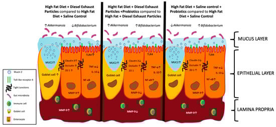Inhalation exposure to traffic-generated PM has been linked with multiple disease states, including gastrointestinal disease, with a 40% increase in IBD hospitalizations [7]. While the mechanisms involved are not fully understood, air pollutants are thought to drive gut dysbiosis and systemic inflammation, which alters the epithelial barrier both through direct and indirect effects. Additionally, a HF diet consumption is understood to increase baseline inflammation both systemically and locally in the intestines [9,40]. Probiotics have shown promising results in promoting a healthy gut microbiome, intestinal integrity, and immunomodulation, yet probiotics have not yet been investigated as a possible treatment for gut permeability caused by environmental stressors [25,41]. In this study, we show for the first time to our knowledge that exposure to inhaled DEP in conjunction with a HF-diet ± probiotic-treatment results in regional and global alterations in the integrity of the small in C57Bl/6 male mice (Figure 9).
