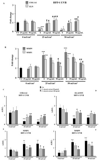 UVR acts on the dermis of the skin, accelerating the hydrolysis of skin collagen and promoting the production of matrix metalloproteinases (MMPs), responsible for the destruction of tissues and the progressive degeneration of the extracellular dermal matrix [6,7,39]. In our experimental model, the pretreatment with C. sinensis extract was able to reduce the deleterious effects of UVB radiation by increasing mRNA and protein expression of type 1 collagen and elastin in HFF1 cells and concomitantly decreasing, in both cell lines, the MMP1 and MMP9 protein and mRNA expression levels with respect to irradiated control cells (Figure 8 and Figure 9). Previous studies demonstrated that in addition to vitamin C, polyphenols, particularly flavonoids, also increased collagen and elastin content and inhibit MMP expression in cell cultures [11,40].