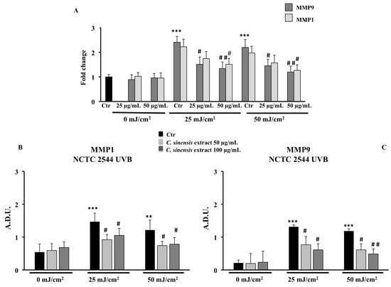 Effects of C. sinensis extract pretreatment (25 and 50 μg/mL) for 4 h on the regulation of (A) the mRNA expression of MMP1 and MMP9; (B,C) protein levels of MMP1 and MMP9 after exposure to UVB (25 and 50 mJ/cm2) in NCTC 2544 cells. (D) Representative immunoblotting image of each protein examined. The data are reported as the mean ± S.D. from two experiments performed in quadruplicates. Dashes to the right of the membrane bands show positions of prestained molecular mass marker. ** Significant vs. untreated control cells: p < 0.01; *** Significant vs. untreated control cells: p < 0.001; # Significant vs. untreated irradiated cells: p < 0.05; ## Significant vs. untreated irradiated cells: p < 0.01.