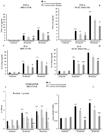 To verify the involvement of inflammation in photoaging, medium from unirradiated or UVB-irradiated cells, with or without C. sinensis extract pretreatment, was collected 24 h post irradiation and assayed for TNF-α, IL-6, and total and phospho-NFkB by ELISA. The TNF-α was undetectable in unirradiated fibroblasts and keratinocytes, while the irradiation enhanced the TNF-α release in a dose-dependent manner in both cell lines. This UVB effect was especially evident in human keratinocytes. By C. sinensis extract pre-treatment, TNF-α levels were reduced, and the 50 µg/mL C. sinensis extract concentration was the most efficient with a drop of nearly 50% (Figure 10A,B). Upon UVB irradiation, IL-6 showed a similar trend to TNF-α with a drastic increase in IL-6 release. Only a pre-treatment with 50 µg/mL of C. sinensis extract decreased the IL-6 amount about 35–40% in both cell lines exposed to 25 and 50 mJ/cm2 UVB (Figure 10C,D). The activation of NFκB p65 by phosphorylation was significantly raised by UVB but inhibited/lessened by C. sinensis extract in a concentration-dependent manner (Figure 10E–H).