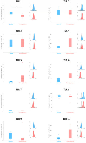 | Toll-like Receptor | Unstimulated G-MSCs (Control) | 1 µg/mL TQ-Stimulated G-MSCs | p-Value |