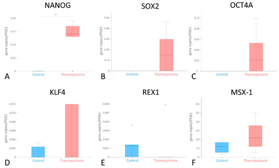 | Stemness Transcriptional Factor | Unstimulated G-MSCs (Control) | 1 µg/mL TQ-Stimulated G-MSCs | p-Value |