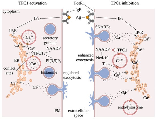 Illustration of the regulation of Ca2+ homeostasis via TPC1 in mast cells. The schematic drawing on the left signifies the role of TPC1 in organellar Ca2+ homeostasis upon IgE-induced exocytosis. FcεR is activated by IgE- and triggers phospholipase C, which, in turn, creates IP3 and DAG (DAG is not depicted). Then, IP3 binds to IP3R, which is located in the ER membrane and releases ER-Ca2+. Interestingly, a reciprocal upregulation of Ca2+ outflow from the ER and the endo-lysosomal system has been identified, which can be regulated by a TPC1-triggered uptake of Ca2+ into the endolysosome; thereby leading to controlled histamine release. Important agonists for TPC1 for this indirectly controlled outflow of Ca2+ from the ER are PI(3,5)P2 and NAADP (left panel). If TPC1 is inhibited pharmacologically with, for example, tetrandrine or indirectly with trans Ned-19 via NAADP-antagonization, TPC1-controlled transport of Ca2+ into the endo-lysosomal system becomes deregulated, which subsequently leads to an accumulation of Ca2+ within the ER (right panel). Consequently, FcεR stimulation and the followed activation of the signaling cascade triggers an elevated ER-Ca2+ outflow which, hence, then results in an enhanced exocytosis of histamine. PM: plasma membrane; IgE: Immunoglobulin E; FcεR: high affinity receptor of the Fc region of IgE; ER: endoplasmic reticulum; IP3R: inositol 1,4,5-triphosphate receptor; NAADP: nicotinic acid adenine dinucleotide phosphate; PI(3,5)P2: phosphatidylinositol 3,5-bisphosphate; SNARE: soluble NSF attachment protein receptor; red crosses: inhibition of TPC1 by Tet or Ned-19 (via NAADP). Created with BioRender.com, accessed on 29 March 2022.
