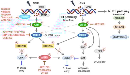 Several types of DNA repair systems, including non-homologous-end-joining (NHEJ), homologous recombination (HR), mismatch repair (MMR), nucleotide excision (NER) and base excision repair (BER), play an important role in maintaining cell viability and genomic stability [2,16,17]. The deregulation of the DDR pathway can cause mutations and genomic instability, thus, leading to cancer development [2,15,16,18]. Nevertheless, defects in the DDR possibly provide a therapeutic advantage, since cells with defective DDR signaling depend on compensatory pathways that can be exploited therapeutically. In the last two decades, a number of DDR inhibitors have been developed and evaluated in clinical settings, including PARP, ATR, ATM, CHK1 and WEE1 inhibitors [4,15,17,19].