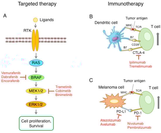 Schematic representation of the main therapeutic approaches against melanoma. (A) The RAS-RAF-MEK1/2-ERK1/2 pathway is often upregulated in melanoma, with a consequent increase in cell proliferation and survival. Pharmacological inhibition of mutant BRAF or kinase MEK1/2 blocks the MAPK pathway. (B) Activation of T cells requires presentation of the tumor antigen to the T-cell receptor (TCR) through the major histocompatibility complex (MHC) and the interaction of CD28 with B7 ligand, present on the surface of dendritic cells. T cells also express CTLA-4, whose binding to B7 triggers the signal to inactivate T cells. Anti-CTLA-4 antibodies inhibit the interaction between CTLA-4 and B7, leading to T cell activation. (C) Melanoma cells can express high levels of PD-L1, which, through the interaction with the PD-1 receptor on the T cells, causes a reduction in T cell function. Blockade of the PD-L1/PD-1 axis with anti-PD-1 or anti-PD-L1 checkpoint inhibitors restores the ability of T cells to recognize and destroy melanoma cells.