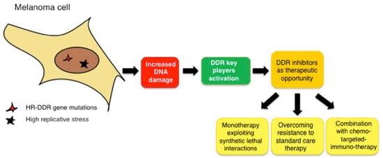 In this review, we summarize preclinical and clinical studies on these novel DDR inhibitors in melanoma (Figure 1). We also discuss recent findings indicating that DDR inhibitors may be a strategy to strengthen the efficacy of current standard-of-care targeted therapy and immunotherapy in melanoma.