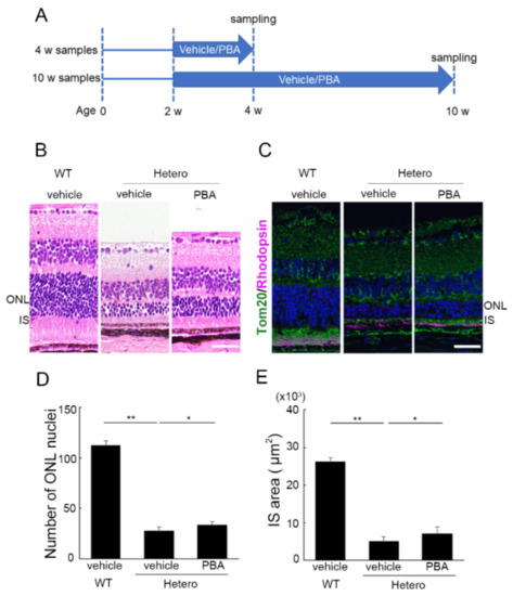 3.3. The Protective Effect of PBA Was Detected in the Photoreceptors of P23H RP Models before Photoreceptor Loss