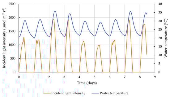 The incident light and temperature conditions for the growth simulation in the LEAPS are shown in Figure 1. The diurnally fluctuating incident light intensity was obtained from the Phase 2 of the North American Land Data Assimilation System (NLDAS2, [22]) between 25 August 2013 and 1 September 2013 near Mesa, Arizona. The water temperature was simulated for a 20 cm deep outdoor pond culture by the Modular Aquatic Simulation System in Two Dimensions (MASS2, [23]) driven by the NLDAS2 meteorological data, including solar radiation, air temperature, wind speed, and dew point temperature.