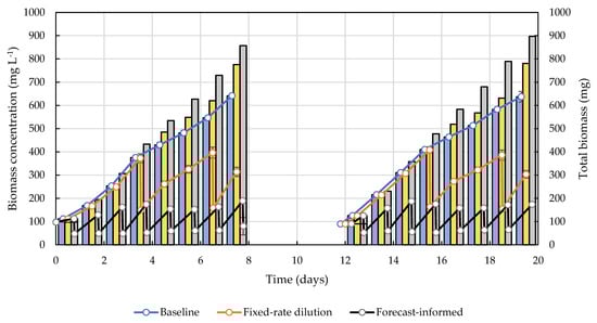 The biomass growth curves of the two repeated batch culture runs are presented in Figure 3. The solid lines represent the biomass measured in the bioreactor over time. The bars represent the total biomass, equal to the sum of the biomass in the reactor and the biomass harvested. For the baseline culture, because there was no harvest, the total biomass (blue bar) was equal to the biomass in the bioreactor (blue dots). For the fixed-rate dilution scenario, the biomass concentration of the culture (orange line) decreased twice due to two 60% dilutions, i.e., on Day 3 and Day 6 for the first batch run and on Day 15 and Day 18 for the second batch run. The total biomass (orange bar) surpassed the baseline after the first harvest and remained the second highest among the three operational scenarios. For the weather-forecast-informed dilution scenario, the culture was harvested every 24 h, and the dilution ratios were 58%, 62%, 80%, 70%, 61%, 60%, 62%, and 71% over the eight days, respectively, as determined by the operation optimization tool. Although the biomass concentration in the reactor remained the lowest, the accumulated total biomass, shown by the gray bar, achieved the highest value at the end.