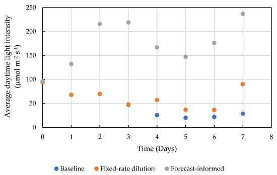 The improvement in biomass productivity was primarily attributed by the increased average light intensity as the culture was being diluted. As shown in Figure 4, the weather-forecast-informed dilution operation kept the average light intensity significantly higher than the other two operations. During cloudy days (Day 4 and 5), the operation optimization tool suggested high dilution ratios (80% and 70%) to minimize the impact of less light, which kept the average light intensity above 150 μmol m−2 day−1, 365% and 550% higher than that in the baseline scenario, and 356% and 192% higher than that in the fixed-rate dilution scenario.
