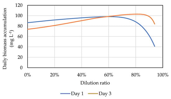 However, it should be pointed out that a high dilution ratio does not necessarily lead to high biomass productivity. Increasing the dilution ratio above the optimal level lowers biomass productivity. In an over-diluted culture, a large portion of the culture may be exposed to over-saturated light intensity, which may cause photoinhibition and slow down biomass growth [24]. Moreover, if the culture is over-diluted, biomass productivity is limited because the number of cells that are able to divide is low. Figure 5 shows an example of how the predicted daily biomass growth (the biomass accumulated in 24 h after dilution) changes with the dilution ratio on Day 1 and Day 3. The optimal dilution ratio for Day 1 is 58%. Due to the coming cloudy day on Day 4, the optimal dilution ratio on Day 3 increased to 80%. On both days, the biomass productivity increases with increasing dilution ratio below the optimal level due to improved light penetration, but a further increase in dilution ratio above the optimal level causes a decline in biomass productivity.