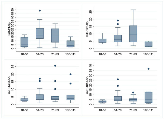 Figure 1 shows the distribution of miRNAs levels in relation to age. For miR-21-5p and miR-126-3p, it is apparent that the maximum values were found in the age ranges 51–70 and 71–99 years, while the ultra-centenarians showed lower levels and the smallest variability. For the miR-146a-5p and miR-181-5p, in all classes of age, it was observed that the median value is around 5 but ultra-centenarians show a higher variability than the other classes of age. Individual points are considered as outliers if, when defining the upper adjacent value U = q3 + (3/2) (q3 − q1) and the lower adjacent value L = q1 − (3/2) (q3 − q1), the point is higher than U or lower than L. The upper (U) and lower (L) adjacent values are defined by Tukey (1977).