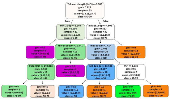 The results of ML are represented in Figure 4. For calculation, miRNAs, C reactive protein, telomeres, paraoxonase (PON), trolox equivalent antioxidant capacity, and malondialdehyde values were considered according to age-ranges. Overall, 100% of subjects under 50 years old have a telomere length of above 0.903, an miR-181a-5p of below 4.606, a miR-21-5p of below 17.04, and an miR-126 -3p of less than 13.586. Individuals with a telomere length greater than 0.903 and a miR-181a-5p greater than 4.606 were between 50 and 70 years. Individuals with a telomere length below 0.903, a miR-21-5p greater than 5.164, a miR-181a-5p less than 11.441 and a PON less than 140.813 were between 71 and 99 years. For ultra-centenarians, the telomere length is always less than 0.903. Additionally, they have an miR-21-5p below 5.164. We also found ultra-centenarians with an miR-21-5p higher than 5.164 but all of them would have had an miR-181a-5p above 11.441.
