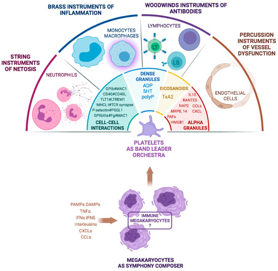 Megakaryocytes and their great orchestra in the septic scene. Platelets interact with components of the circulating blood, as well as with the endothelial cells, and are also able to guide monocytes/macrophages to subendothelial infection sites. To do this, they engage in a wide repertoire of interactions, ranging from direct cell interactions to indirect interactions via the secretion of alpha and dense granule contents and the production of eicosanoids. In this ensemble, MKs, medullary or circulating, are also able to sense and respond to certain sepsis-specific signals, such as PAMPs, DAMPs, and cytokines/chemokines. This response can be a quantitative one but also functional, i.e., a dedicated production of platelets with immune functions.