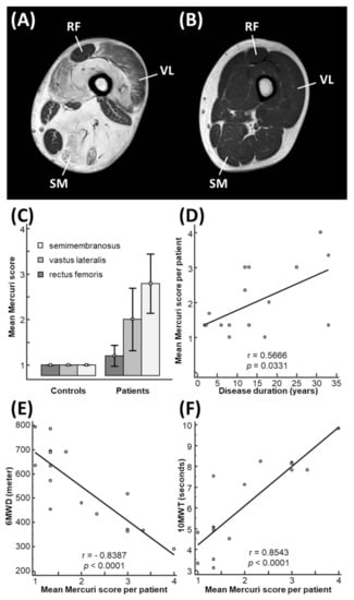 Mercuri score is correlated with functional outcomes in LGMD-R12 patients. (A) Axial MRI section through the left thigh of patient 6, indicating the differential involvement of the target muscles: rectus femoris (RF) with Mercuri score 1, vastus lateralis (VL) with Mercuri score 3 and semimembranosus (SM) with Mercuri score 4. (B) A similar axial MRI slice of a control individual is shown. All muscles in healthy controls are per inclusion criterion normal and thus have a Mercuri score of 1. (C) Mean Mercuri score for all patients and for all controls is shown for the three target muscles. The bars indicate the 95% confidence interval. (D) A significant correlation between the mean Mercuri score per patient (dots) and the disease duration is shown in a scatter diagram, with “r” indicating the Pearson correlation coefficient, and “p” the p-value. (E,F) Scatter diagrams illustrating a significant increase in the Mercuri score with decreasing 6MWD (E) and with increasing 10MWT (F).