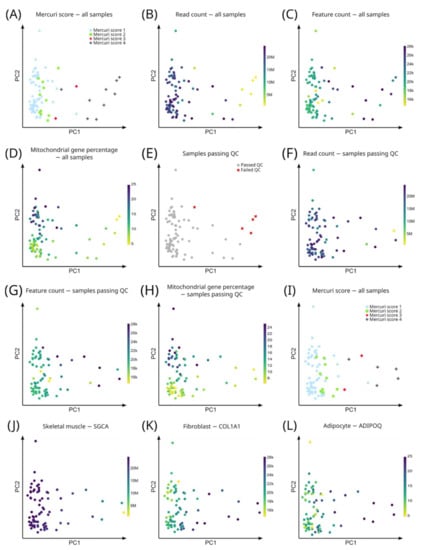 Unbiased transcriptome analysis of all genes. (A) PCA of all samples (n = 84), color coded for Mercuri score. (B) PCA of all samples (n = 84), color coded for read count. Note that samples with the highest Mercuri score had overall lower sequencing depth, which can be explained by the fact that the cellularity in high Mercuri score samples is lower due to replacement of muscle cells with fibrotic and adipose tissue. If there is low cellularity, then we also have lower transcripts and hence fewer reads that map to those transcripts. (C) PCA of all samples included in the study (n = 84), color coded for feature (gene) count. Note that samples with the highest Mercuri score had overall highest feature (gene) count. (D) PCA of all samples included in the study (n = 84), color coded for mitochondrial feature (gene) count. (E) PCA of all samples included in the study (n = 84), color coded for passing (grey, n = 79) or failing (red, n = 5) quality control (QC). All samples with 1M or more reads were considered to have passed QC. (F) PCA of samples that passed QC (n = 79), color coded for read count. (G) PCA of samples that passed QC (n = 79), color coded for feature (gene) count. (H) PCA of samples that passed QC (n = 79), color coded for mitochondrial feature (gene) count. (I) PCA of samples that passed QC (n = 79), color coded for Mercuri score. (J) PCA of samples that passed QC (n = 79), color coded for SGCA gene expression. Note, SGCA is a protein of the muscle membrane and SGCA gene expression (muscle membrane marker) was reduced in samples with higher Mercuri scores. (K) PCA of samples that passed QC (n = 79), color coded for COL1A1 gene expression (fibroblast marker). (L) PCA of samples that passed QC (n = 79), color coded for ADIPOQ gene expression (adipocyte marker). In the PCA plots each sample is represented by a dot. The dots are placed on the graph in function of their gene signatures, the closer the dots are together, the more similar their gene expression profile is.