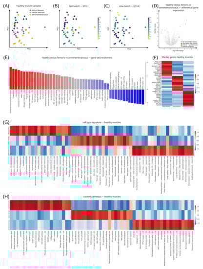 To investigate the hypothesis that baseline differences in the molecular composition of different muscles influence susceptibility to muscular dystrophy, we performed a detailed analysis of gene signatures of the three biopsied muscles in healthy control individuals. We first performed a PCA analysis, which showed a clear separation of semimembranosus, vastus lateralis and rectus femoris on the third component (this first component highlighted a lowly sequenced outlier sample) (Figure 4A). Color coding PCA plots for marker genes for fast- and slow-twitch muscle showed a clear gradient, with the rectus femoris showing the highest expression of the fast-twitch muscle myosins (myosin heavy chain 4 (MYH4), myosin heavy chain 2 (MYH2), myosin heavy chain 1 (MYH1) and myosin light chain 1 (MYL1)) and the semimembranosus presenting the highest expression of the slow-twitch markers (myosin heavy chain 7 (MYH7), myosin heavy chain 6 (MYH6) and myosin light chain 3 (MYL3)) (Figure 4B,C) [51,52]. The vastus lateralis expressed intermediate levels of fast- and slow-twitch myosins. Differential analysis and gene set analysis between the most affected (semimembranosus) and less affected (rectus femoris) muscles showed differences in genes that regulated anterior–posterior axis planning, fast- and slow-twitch muscle fibers and satellite cell marker genes (Figure 4D,E).