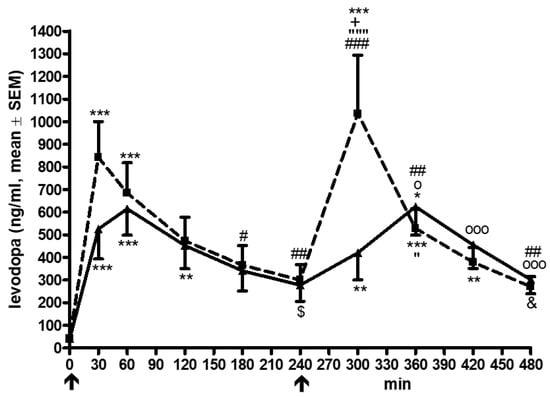 Curve of L-dopa plasma concentrations. All data are given as mean ± standard error of means (SEM); min, minutes; ↑ marks the L-dopa/DDI intake at moment 0 and after 240 min; opicapone was taken at −30 min; L-dopa plasma levels are given in ng/mL, thcys concentrations in µmol/L; lines of the L-dopa/carbidopa plus opicapone condition are dashed with ■; lines of the L-dopa/carbidopa/entacapone condition are continuous with ▲; comparisons of the post hoc analysis: *, p < 0.05, ** p < 0.01, *** p < 0.001; * reports comparisons against moment 0; #, p < 0.05, ## p < 0.01, ### p < 0.001; # reports comparisons against moment 30; $, p < 0.05; $ reports comparisons against moment 60; + p < 0.05, + reports comparisons against moment 120; &, p < 0.05; & reports comparisons against moment 180; “, p < 0.05; “““, p < 0.001; “ reports comparisons against moment 240; o, p < 0.05; ooo, p < 0.001; o reports comparisons against moment 300; symbols for the post hoc analysis and error bars are above the curve of the L-dopa/carbidopa plus opicapone condition; symbols for the post hoc analysis and error bars are below the curve of the L-dopa/carbidopa/entacapone condition.