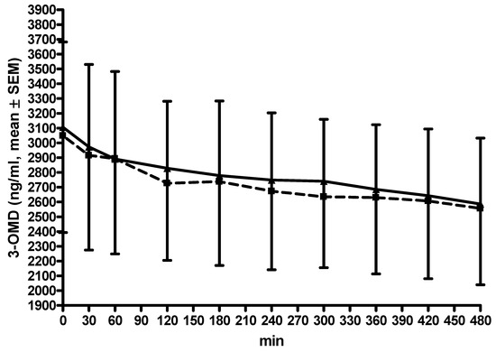 The AUC and Cmax values as well as the concentrations at each moment did not differ between both investigation days (Table 2, Figure 3). Thycs decreased during LD/CD/EN application (ANOVA F = 2.81, p < 0.0001, post hoc analysis: moment 0 vs. 420: p < 0.01), but not during LD/CD/OP application (ANOVA F = 1.93, p = 0.054). There was a weak correlation between the computed differences in AUC 3-OMD and AUC thcys between LD/CD/OP and LD/CD/EN (R = −0.56, p = 0.03).