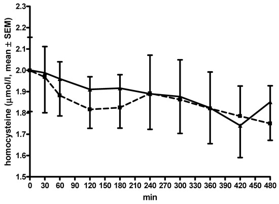 Curve of total homocysteine. All data are given as mean ± standard error of means (SEM); min, minutes; opicapone was taken at −30 min; thcys concentrations in µmol/L; lines of the L-dopa/carbidopa plus opicapone condition are dashed with ■; lines of the L-dopa/carbidopa/entacapone condition are continuous with ▲; error bars are above the curve of the L-dopa/carbidopa plus opicapone condition; error bars are below the curve of the L-dopa/carbidopa/entacapone condition.