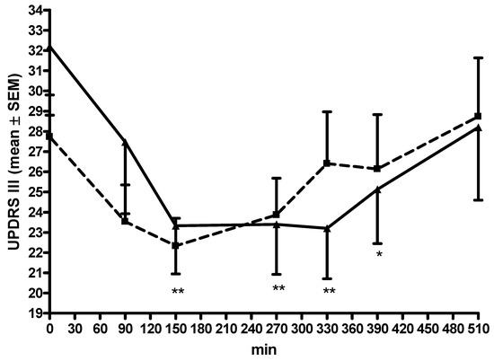 Scoring outcomes over the interval. All data are given as mean ± standard error of means (SEM); min, minutes; UPDRS III, Unified Parkinson’s Disease Rating Scale for motor examination; lines of the L-dopa/carbidopa plus opicapone condition are dashed with ■; lines of the L-dopa/carbidopa/entacapone condition are continuous with ▲; comparisons of the post hoc analysis: * p < 0.05, ** p < 0.01; * reports comparisons against moment 0; error bars are above the curve of the L-dopa/carbidopa plus opicapone condition; error bars are below the curve of the L-dopa/carbidopa/entacapone condition.