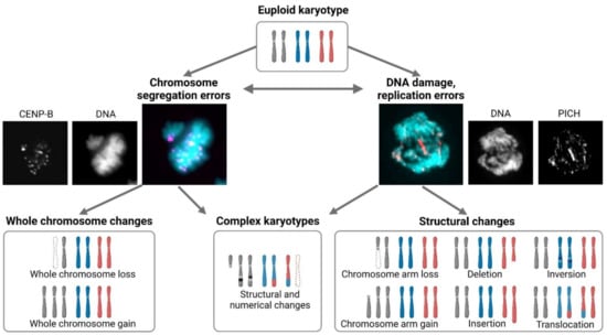 Karyotypic changes and their origins. Eukaryotic cells with euploid karyotype contain usually a diploid chromosome set. Chromosome segregation errors during mitosis result usually in whole chromosome alterations. Chromosome missegregation can occur through various defects in centromere, kinetochore, and spindle proteins. Unattached and lagging chromosomes can be detected by microscopy. DNA damage or replication stress can result in unrepaired or underreplicated DNA, which manifests itself as defect during anaphase as chromatin and/or ultrafine bridges that are visualized by immunostaining of associated proteins (such as PICH). Lack of repair and erroneous resolution of these bridges leads to chromosome breakage and subsequent losses or gains, insertions, deletions, inversions, or translocations. It should be noted that missegregation can also result in DNA damage and vice versa. DNA repair and replication defects may increase the occurrence of segregation errors. Karyotypes in cancer are frequently diverse, displaying combinations of structural and numerical changes. DNA staining (DAPI; cyan), immunostaining of a centromeric protein CENP-B (magenta), and the helicase PICH (red).