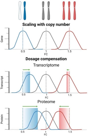 Loss of a chromosome affects both mRNA and protein abundance of all genes encoded on the missing chromosome in all organisms studied to date. When diploid cells lose a chromosome, the expected expression level should be half of the diploid expression level (0.5-fold change, or −1 log2FC; Figure 2). Indeed, analysis of the transcriptional consequences of chromosome loss in genetically distinct diploid and aneuploid blastocysts revealed reduced expression of genes encoded on the monosomes [80]. Similarly, significant downregulation of mRNA abundance was found for 64% of genes encoded on chromosome 3p following the deletion of this chromosome arm in human cells [24]. Importantly, expression does not always scale with the gene copy numbers. In a monosomy 5 strain of Candida albicans, nearly 40% of transcripts encoded on chromosome 5 were expressed at the diploid level [101]. Transcriptome analysis of 16 aneuploid maize lines with varied dosage of multiple chromosomal segments (monosomy to tetrasomy) showed a broad range of gene-dosage effects, from the mRNA abundance correlating with the gene dosage to dosage compensation [102]. Dosage compensation at the transcriptional level was also observed upon a loss of large fragments of sex chromosomes and autosomes in Drosophila melanogaster, with log2FC ranging from −0.9 to −0.52, depending on the individual monosomic region [103,104,105]. Interestingly, the compensation was anti-correlated with the number of ORFs encoded on each chromosome [105].