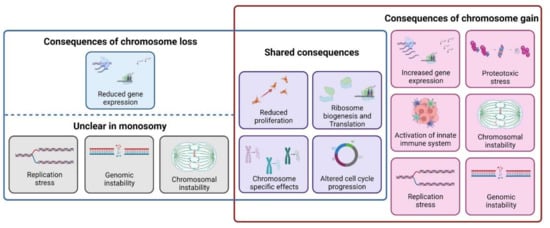While the cellular response to monosomy and trisomy looks similar at a first glance—both gains and losses result in decreased proliferation and many physiological changes—it is noteworthy that only a few phenotypes are common, and the genome wide gene expression changes in cells with gain and loss of a chromosome are rather different (Figure 4). The cellular response to chromosome gains is thought to be caused by the low but chronic overexpression of several hundreds of genes on the extra chromosomes, leading to proteotoxic stress [9,10]. Protein homeostasis is affected by increased protein abundance and by imbalanced stoichiometry of subunits of multimolecular complexes. In contrast, chromosome loss does not saturate the protein folding machinery, as there is no excess proteins to be folded. Although the imbalanced stoichiometry due to chromosome loss could potentially cause proteotoxic stress, monosomies were not sensitive to 17-AAG, an inhibitor of a protein folding factor HSP90. Further, monosomy does not affect autophagy, in contrast to cellular response upon chromosome gains [91]. Together, these findings suggest that monosomic cells do not suffer from proteotoxic stress. In addition, presence of even one extra chromosome causes replication stress and reduced expression of DNA replication-dependent proteins [11,18,135,136]. However, chromosome loss does not lead to replication stress, and expression of replication stress markers, such as phosphorylation of RPA32 and CHK1 proteins remained unchanged in monosomies compared to diploids [91,92] (preprint). Additionally, pathway changes previously identified in cells with extra chromosome were not observed in monosomic cells [91]. Thus, it appears that chromosome loss elicits a strikingly different response than chromosome gain. However, there are limitations that make a direct comparison of the currently available monosomic and tri-/tetrasomic model systems difficult. First, the altered chromosomes are not identical, so the chromosome-specific effects can occlude the conclusions. Second, the findings to date have been based on few karyotypes, and the genetic background of the current model systems does not allow direct comparison, for example, due to differential expression of p53. Future studies should aim to obtain isogenic cell lines for identical chromosome losses and/or gains to directly investigate the differences and similarities in cellular response to chromosome gains and losses.
