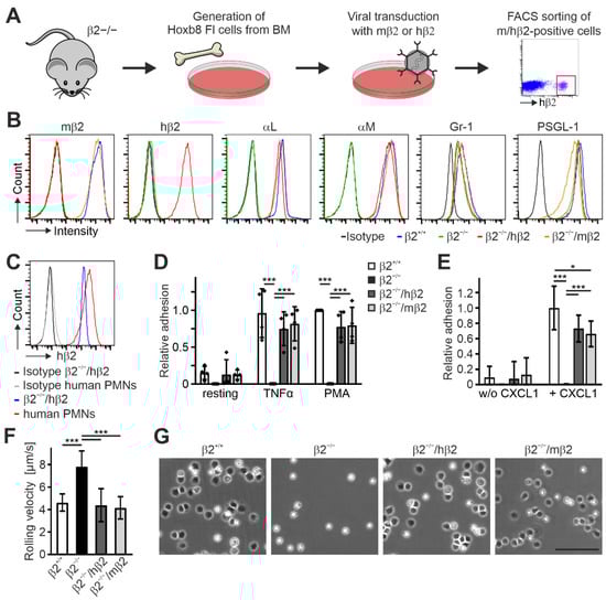 Integrin β2 can be substituted by its human homolog in mouse Hoxb8 FL cells. (A) Scheme of workflow. Hoxb8 FL cells were generated from bone marrow of integrin β2-deficient mice and retrovirally transduced with mouse or human integrin β2. Human/mouse integrin β2-positive cells were FACS-sorted. (B) Surface expression of different integrin subunits and cell markers on neutrophil-like cells differentiated from control (β2+/+), integrin β2 ko (β2−/−), and human or mouse integrin β2-rescued integrin β2−/− (β2−/−/hβ2 and β2−/−/mβ2) Hoxb8 FL cells assessed by FACS analysis. (C) Integrin β2 surface expression levels on neutrophil-like cells differentiated from integrin β2−/− Hoxb8 FL cells retrovirally transduced with human integrin β2 (β2−/−/hβ2) compared to PMNs isolated from human blood. (D) Static adhesion of untreated, TNFα-treated, or PMA-treated Hoxb8 FL-derived β2+/+, β2−/−, β2−/−/hβ2, and β2−/−/mβ2 neutrophils on ICAM1. N = 4. Individual data points of the 4 independent experiments are shown. (E,F) Adhesion (E) and rolling velocities (F) of neutrophil-like cells differentiated from β2+/+, β2−/−, β2−/−/hβ2, and β2−/−/mβ2 Hoxb8 FL cells in flow chambers coated with ICAM1 and P-selectin with or without CXCL1 under constant shear rate of 1 dyn/cm2. N = 10/11 chambers with CXCL1 (rolling and adhesion); N = 3/4 without CXCL1 (adhesion). (G) Neutrophil-like β2+/+, β2−/−, β2−/−/hβ2, and β2−/−/mβ2 cells plated on a P-selectin-, ICAM1-, and CXCL1-coated surface for 10 min. Scale bar: 100 µm. All values are given as mean ± SD. * p < 0.05, *** p < 0.001.
