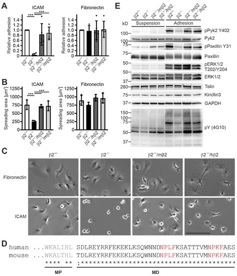 Expression of human integrin β2 rescues spreading and adhesion defects in mouse integrin β2 knockout macrophages. (A) Adhesion of integrin β2−/− and human or mouse integrin β2 expressing integrin β2−/− macrophages to ICAM1 and fibronectin in relation to control macrophages. N = 5. Individual data points represent the 5 independent experiments. (B) Spreading of control, integrin β2−/−, and human or mouse integrin β2 expressing integrin β2−/− macrophages to ICAM1 and fibronectin assessed 2 h after plating. N = 3 independent experiments, shown as individual data points. (C) Hoxb8-derived β2+/+, β2−/−, β2−/−/hβ2, and β2−/−/mβ2 macrophages plated on an ICAM1- or fibronectin-coated surface for 2 h. Scale bar: 100 µm. (D) Alignment of the amino acid sequence of the mouse and human β2 integrin cytoplasmic tails. Talin-binding NPLF and kindlin-binding NPKF motives are highlighted in red. MP, membrane proximal; MD, membrane distal. (E) Control, integrin β2−/−, and human or mouse integrin β2 expressing integrin β2−/− macrophages were either kept in suspension or plated on ICAM1 for 20 min to assess integrin-mediated signaling. Western blot analyses for Y402-phosphorylated and total Pyk2; Y31-phosphorylated and total paxillin; T202/Y204-phosphorylated and total ERK1/2; talin; kindlin3; and general tyrosine phosphorylation. GAPDH served as loading control. All values are given as mean ± SD. *** p < 0.001.