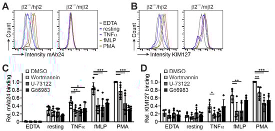 In a second approach, we wanted to investigate whether these cells are also suitable to provide insights into the upstream signaling cascades that regulate this process. Therefore, we stimulated Hoxb8-β2−/−/hβ2 PMN-LCs with the same agonists and simultaneously treated them with inhibitors of phosphatidylinositol-3-kinases (PI3K), phospholipase C (PLC), and protein kinase C (PKC), which are central signaling nodes that control β2 integrin activation. These experiments demonstrated that their inhibition significantly impaired β2 integrin activation in humanized PMN-LCs, as evidenced by decreased binding of KIM127 and mAb24 (Figure 3C,D). This finding indicates that these cells also serve as a useful model for studying integrin inside-out signaling pathways.