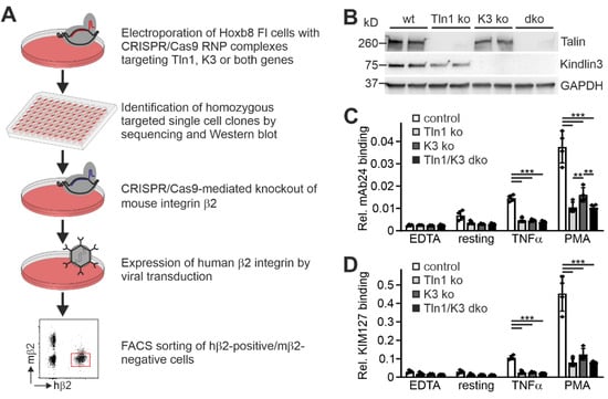 Both talin1 and kindlin3 are required for β2 integrin activation. (A) Scheme of workflow. Talin1, kindlin3, and talin1/kindlin3 double-deficient Hoxb8 FL cells were generated via the CRISPR/Cas9 system. Single cell clones were screened for talin1 and kindlin3 expression. Four clones per genotype were subjected to CRISPR/Cas9-mediated integrin β2 ablation and retrovirally transduced to express human integrin β2. Mouse integrin β2-negative and human integrin β2-positive cells were FACS-sorted. (B) Western blot analysis of neutrophil-like cells differentiated from different human integrin β2 expressing Hoxb8 single cell clones, in which talin1 and/or kindlin3 were ablated with the CRISPR/Cas9 system. GAPDH served as loading control. (C,D) Relative mAb24 (C) and KIM127 (D) binding to neutrophil-like cells derived from Hoxb8 single cell clones, expressing human integrin β2 and lacking talin1 and/or kindlin3 expression. N = 4 clones. Result of each clone is plotted as individual data point. All values are given as mean ± SD. ** p < 0.01, *** p < 0.001.