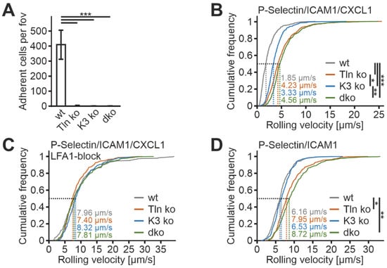 To further investigate the suitability of humanized β2 integrin Hoxb8 cells as a cell reporter system to test integrin activity, we measured mAb24 and KIM127 binding in the absence of the two key integrin regulators, talin1 and kindlin3. Therefore, we destroyed both genes in Hoxb8 cells by CRISPR/Cas9-mediated gene deletion. In a first experiment, we electroporated Hoxb8 cells with Cas9–RNP complexes targeting talin1 and kindlin3 genes to generate individual Hoxb8 cell clones that showed homozygous deletion of either talin1, kindlin3, or both genes, confirmed by sequencing and Western blot analyses. Wild-type and mutant Hoxb8 cell clones were then electroporated again with Cas9–RNP complexes targeting the Itgb2 gene and subsequently infected with a human ITGB2 cDNA carrying retrovirus before we selected mouse integrin β2-negative and human β2-positive cells by FACS (Figure 4A,B). Wild-type and mutant Hoxb8-β2−/−/hβ2 cell clones were then differentiated into PMN-LCs, stimulated with TNFα and PMA, and analyzed for KIM127 and mAb24 binding by flow cytometry. This experiment led to several interesting results. (i) To our surprise, kindlin3 deficiency not only impaired mAb24 binding, as previously shown, but also abolished KIM127 binding, which is in contrast to the previous view that kindlin3 is required for the induction of the high-affinity conformation but not for initial ectodomain extension [26,41]. Thus, under the conditions chosen here, upon stimulation with soluble agonists, both talin1 and kindlin3 are required for β2 integrin extension (Figure 4C,D). (ii) Loss of either talin1 or kindlin3 results in a similar defect in integrin activation. However, very strong activation with the non-physiological agonist PMA allowed some more integrins to become fully activated in the absence of kindlin3, as indicated by slightly increased mAb24 binding (Figure 4C). (iii) Combined deletion of both integrin activators does not further decrease integrin activity, indicating that both regulators are absolutely required for β2 integrin activation (Figure 4C,D). Accordingly, PMN-LCs lacking either kindlin3 or talin1 failed to adhere under flow on P-selectin-, ICAM1-, and CXCL1-coated surfaces, similar to PMN-LC lacking both kindlin3 and talin1 (Figure 5A). Moreover, under these conditions, their rolling velocities were significantly increased compared to wild-type PMN-LCs, although kindlin3-deficient PMN-LCs showed an intermediate phenotype and rolled slower than talin1-deficient PMN-LC (Figure 5B). Of note, the differences in rolling velocity between genotypes completely disappeared when cells were treated with LFA-1-blocking antibody prior to the experiment (Figure 5C). On the other hand, P-selectin-induced integrin-mediated slow rolling (in the absence of chemokine) was comparable between kindlin3-deficient and wild-type PMN-LCs, whereas talin1-deficient cells showed faster rolling (Figure 5D). These results suggest that P-selectin-induced integrin-mediated slow rolling is not affected by the absence of kindlin3, but additional chemokine-induced slower rolling that eventually leads to cell arrest is affected by the absence of kindlin3.