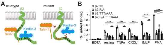 Talin and/or kindlin3 binding-deficient human integrin β2 exhibit impaired integrin activation. (A) Scheme of the integrin β2 cytoplasmic domain, which binds talin1 via a membrane proximal NPLF motif and kindlin3 via a membrane-distal NPKF and a TTT motif (left). Mutation of these motifs to NPLA and AAA prevent talin1 and kindlin3 binding, respectively (right). (B) Relative mAb24 binding to neutrophil-like cells derived from Hoxb8 cells expressing human wild-type integrin β2, mutant integrin β2 F/A (F754A), mutant integrin β2 TTT/AAA (T758A, T759A, T760A), or double-mutant integrin F/A TTT/AAA in response to TNFα, CXCL1, fMLP, and PMA or left untreated. N = 5 experiments indicated as individual data points. All values are given as mean ± SD. * p < 0.05, ** p < 0.01, *** p < 0.001.