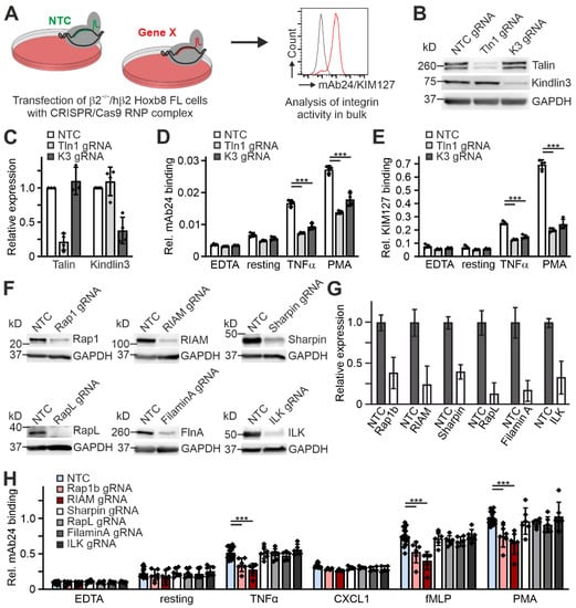 Rapid CRISPR-based screening approach to study putative β2 integrin regulators. (A) Scheme of workflow. Integrin β2−/− Hoxb8 cells expressing human integrin β2 were electroporated with a control Cas9/gRNA complex (non-targeting control, NTC) or a Cas9/gRNA complex targeting a gene of interest. Cells were analyzed for integrin activity in bulk after differentiation into neutrophil-like cells. (B) Western blot analysis of talin1 and kindlin3 expression in Hoxb8-derived neutrophil-like cells transfected with Cas9 RNP loaded with either a non-targeting (NTC), a talin1-targeting (Tln1 gRNA), or a kindlin3-targeting (K3 gRNA) guide RNA. GAPDH served as loading control. (C) Densitometric quantification of talin1 and kindlin3 expression exemplarily shown in (B). N = 4 transfections. (D,E) Integrin β2 activation of the cells described in (B) assessed by FACS as relative mAb24 (D) and KIM127 (E) binding. Cells were either left untreated or treated with EDTA, TNFα, or PMA. N = 4 transfections. (F) Western blot analysis of Rap1, RIAM, Sharpin, RapL, Filamin A, and ILK expression in Hoxb8-derived neutrophil-like cells transfected with Cas9 RNP loaded with either a non-targeting RNA (NTC) or a guide RNA targeting Rap1, RIAM, Sharpin, RapL, Filamin A, or ILK. GAPDH served as loading control. (G) Densitometric quantification of Rap1, RIAM, Sharpin, RapL, Filamin A, and ILK expression exemplarily shown in (F). N = 6 transfections. (H) Integrin β2 activation of the cells described in (F) assessed by FACS as relative mAb24 binding. Cells were either untreated or treated with EDTA, TNFα, CXCL1, fMLP, or PMA. N = 6 transfections. The data points represent the results of the individual experiments. Values are given as mean ± SD. *** p < 0.001.