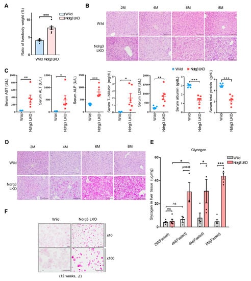 3.1. Liver-Specific Ablation of NDRG3 Results in Excessive Hepatic Glycogen Accumulation and Liver Injury